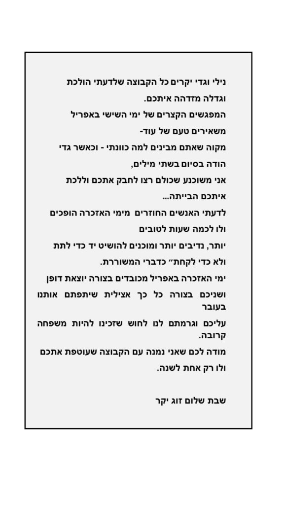 ואחר כך ההתכנסות בבית שלכם שהיא מן המשך של השבעה שיושבים מדי שנה לשעות ספורות. משהו שיוצר איזשהו רצף בזמן שהוא חשוב. לי לפחות.