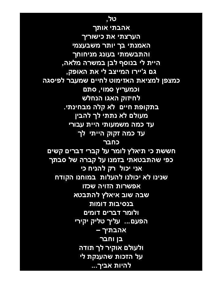 גדי עם תום 30 שלושים גדי עם תום 30 רון לשלושים אזכרה ראשונה אנשי הכפר גדי ביום השנה מיכל ביום השנה זר לא יבין זאת רון ביום השנה דניאל שני מניו יורק שיר עוז לשנה רז פרידמן ביום השנה אזכרה שניה אראל אחרי שנתיים גדי בשנתיים מרים בשנתיים עופר וולף על נחיתת האונס שחר גורן אחרי שנתיים שיר עוז במכתב לחבר שהלך ללא שוב אזכרה שלישית גדי בשנה השלישית מירב אורבך – לחבר של החבר שלי פלור- זכרונות עצורים תמר בשנה השלישית נילי – Funeral Blues 🔊 אזכרה רביעית כשיש יותר מדי חכמה רון בשנה הרביעית גדי בשנה הרביעית מיכל זכיתי לאהוב עדי אפריימי כהן מרים – כיצד זוכרים? דביר חלמיש אזכרה חמישית גדי בשנה החמישית מרים בשנה החמישית מיכל בהרהורים שאחרי נבות בשנה החמישית 🔊 Richard Cory – עירית אלירז 🔊 אזכרה שישית גדי – צו קריאה רון – פיות פעורים אראל על שבריריות החיים מאיר שניצקי ז"ל על העמוד היציב ירדנה מדר – כפר רפאל אזכרה שביעית גדי – הגיגים מכרכום רז יריב בשנה השביעית קצר פה כל כך האביב – דויד גרוסמן הפעם הראשונה – נתן זך מרים בשנה השביעית – אגדה חסידית אזכרה שמינית גדי בשנה השמינית דורון בילב נעה בוסתן הילה נדל מרים – פריחת הדובדבן נילי – לעולם לא אשמע את קולו המתוק של האלוהים / יונה וולך תמר בשנה השמינית אזכרה תשיעית למה לי לחשוב? – מהמחברת של טל שיר מימי 160 דפנה מברכת את טל הילה בעקבות האזכרה התשיעית מרים באזכרה התשיעית דפנה ליכט – חלום עקבותיך / אברהם חלפי רון קורא – ניפרד מאלה שקשה לעזבם / אברהם חלפי אזכרה עשירית כבר עשר שנים…🎬 רון – תדעו כולכם שהוא כבר לא ישוב מיכל – מסכמת ממילותיה של לאה גולדברג מרים – עשר שנים אזכרה אחת עשרה דיתי מתבטאת בפעם הראשונה ד"ר קורח נילי עדי – חבר לקורס, לטייסת פאלטת הצבעים של טל – הילה נדל אזכרה שתים עשרה גדי – פתיח טל שלי – נילי רון – קראתיו דורי רון – אשרי השחרור משפחת אורן משפחת פסטרנק אזכרה שלוש עשרה גדי 2019 נילי 2019 הברוש צמרתו אט הרכין – מרים הילה , השכנה ממול ירדנה וצבי מדר מכפר רפאל אזכרה ארבע עשרה מכתבים לאור ביטול האזכרה אזכרה חמש עשרה גדי 2021 דיתי – מכתבה של יעל דפנה – מילותיו של גרוסמן נילי 2021 תיעוד האזכרה 2021 🎬 אזכרה שש עשרה אמיתי זיו ד"ר קורח – שימבורסקה נילי 2022 גדי 2022 אזכרה שבע עשרה המגירות- שחר גורן על טל שלא הכרתי – ירון רבינוביץ הילה נדל – בהיותה בהקרנות בוינה מיכל של טל – אתכם גדי – "כנפי הכסף" נילי – אובדן אזכרה שמונה עשרה הזמנה לאזכרה – אחרי 7 לאוקטובר גדי – לנוכח המחדל נילי – מה אם טל היה פה איתנו הילה – פרפר נחמד