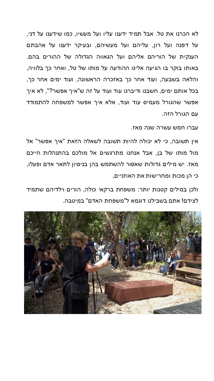 דיתי – מכתבה של יעל שלושים גדי עם תום 30 רון לשלושים אזכרה ראשונה אנשי הכפר גדי ביום השנה מיכל ביום השנה זר לא יבין זאת רון ביום השנה דניאל שני מניו יורק שיר עוז לשנה רז פרידמן ביום השנה אזכרה שניה אראל אחרי שנתיים גדי בשנתיים מרים בשנתיים עופר וולף על נחיתת האונס שחר גורן אחרי שנתיים שיר עוז במכתב לחבר שהלך ללא שוב אזכרה שלישית גדי בשנה השלישית מירב אורבך – לחבר של החבר שלי פלור- זכרונות עצורים תמר בשנה השלישית נילי – Funeral Blues 🔊 אזכרה רביעית כשיש יותר מדי חכמה רון בשנה הרביעית גדי בשנה הרביעית מיכל זכיתי לאהוב עדי אפריימי כהן מרים – כיצד זוכרים? דביר חלמיש אזכרה חמישית גדי בשנה החמישית מרים בשנה החמישית מיכל בהרהורים שאחרי נבות בשנה החמישית 🔊 Richard Cory – עירית אלירז 🔊 אזכרה שישית גדי – צו קריאה רון – פיות פעורים אראל על שבריריות החיים מאיר שניצקי ז"ל על העמוד היציב ירדנה מדר – כפר רפאל אזכרה שביעית גדי – הגיגים מכרכום רז יריב בשנה השביעית קצר פה כל כך האביב – דויד גרוסמן הפעם הראשונה – נתן זך מרים בשנה השביעית – אגדה חסידית אזכרה שמינית גדי בשנה השמינית דורון בילב נעה בוסתן הילה נדל מרים – פריחת הדובדבן נילי – לעולם לא אשמע את קולו המתוק של האלוהים / יונה וולך תמר בשנה השמינית אזכרה תשיעית למה לי לחשוב? – מהמחברת של טל שיר מימי 160 דפנה מברכת את טל הילה בעקבות האזכרה התשיעית מרים באזכרה התשיעית דפנה ליכט – חלום עקבותיך / אברהם חלפי רון קורא – ניפרד מאלה שקשה לעזבם / אברהם חלפי אזכרה עשירית כבר עשר שנים…🎬 רון – תדעו כולכם שהוא כבר לא ישוב מיכל – מסכמת ממילותיה של לאה גולדברג מרים – עשר שנים אזכרה אחת עשרה דיתי מתבטאת בפעם הראשונה ד"ר קורח נילי עדי – חבר לקורס, לטייסת פאלטת הצבעים של טל – הילה נדל אזכרה שתים עשרה גדי – פתיח טל שלי – נילי רון – קראתיו דורי רון – אשרי השחרור משפחת אורן משפחת פסטרנק אזכרה שלוש עשרה גדי 2019 נילי 2019 הברוש צמרתו אט הרכין – מרים הילה , השכנה ממול ירדנה וצבי מדר מכפר רפאל אזכרה ארבע עשרה מכתבים לאור ביטול האזכרה אזכרה חמש עשרה גדי 2021 דיתי – מכתבה של יעל דפנה – מילותיו של גרוסמן נילי 2021 תיעוד האזכרה 2021 🎬 אזכרה שש עשרה אמיתי זיו ד"ר קורח – שימבורסקה נילי 2022 גדי 2022 אזכרה שבע עשרה המגירות- שחר גורן על טל שלא הכרתי – ירון רבינוביץ הילה נדל – בהיותה בהקרנות בוינה מיכל של טל – אתכם גדי – "כנפי הכסף" נילי – אובדן אזכרה שמונה עשרה הזמנה לאזכרה – אחרי 7 לאוקטובר גדי – לנוכח המחדל נילי – מה אם טל היה פה איתנו הילה – פרפר נחמד